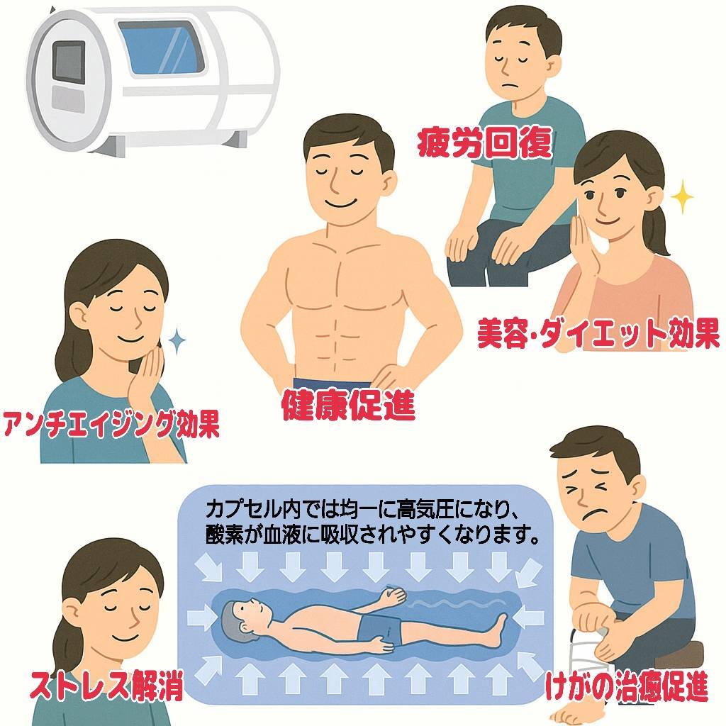 高圧酸素カプセルは細胞の隅々まで酸素を供給しますので、細胞が活性化し、だるさ・寝不足・目の疲れ・ストレス解消に効果が期待されます。